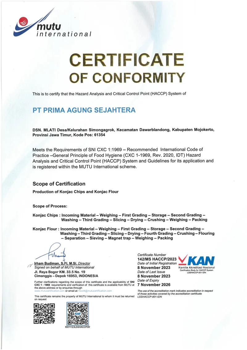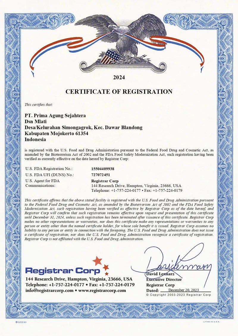 dalam kualitas, keamanan pangan, dan regulasi global. Sertifikasi ini memastikan bahwa produk kami memenuhi