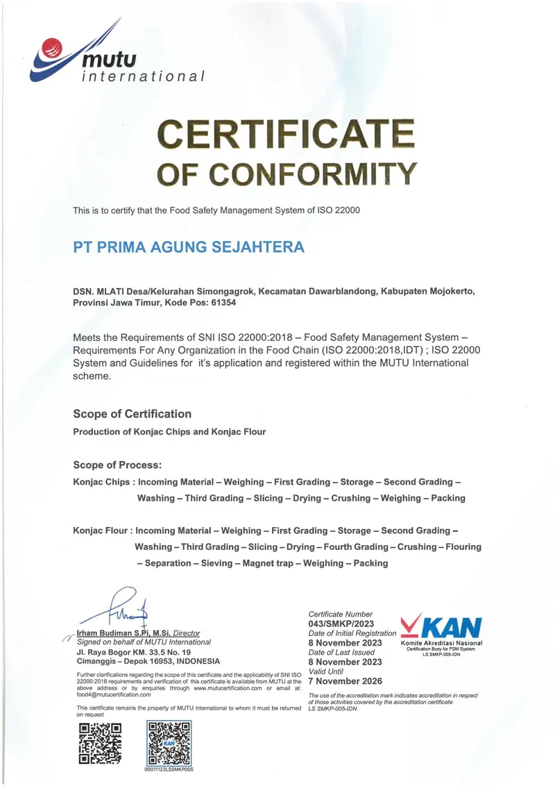 PT. PRIMA AGUNG SEJAHTERA telah memperoleh sertifikasi